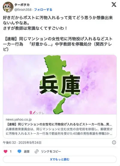 40歳中学教師、マンションの隣人女性を好きになり排泄物をポストに投函 停職3ヶ月