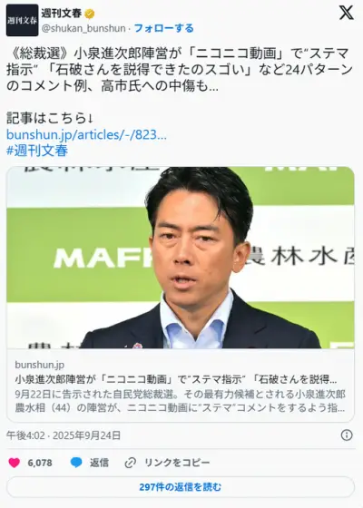 小泉進次郎陣営が「ニコニコ動画」で“ステマ指示” 24パターンのコメント例、高市氏への中傷も…