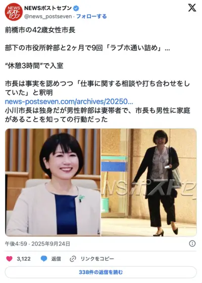 前橋市の42歳女性市長、部下と度々ラブホテル