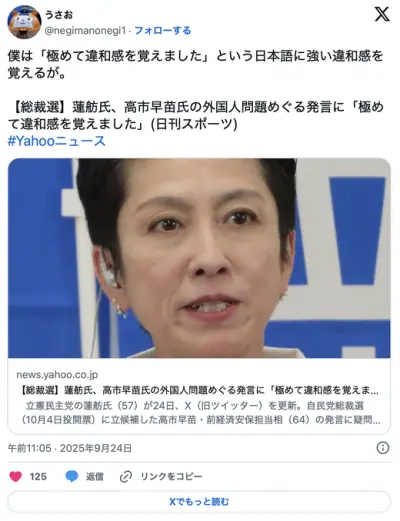 蓮舫氏、高市早苗氏の外国人問題めぐる発言に「極めて違和感を覚えました」