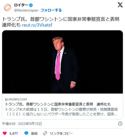 【速報】 トランプ米大統領、首都ワシントンに国家非常事態宣言