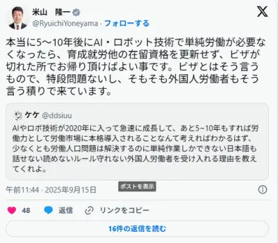 【悲報】米山隆一さん、「AIやロボットが発達して単純労働が無くなったら移民には帰って貰えばいい」