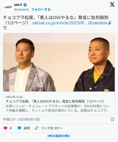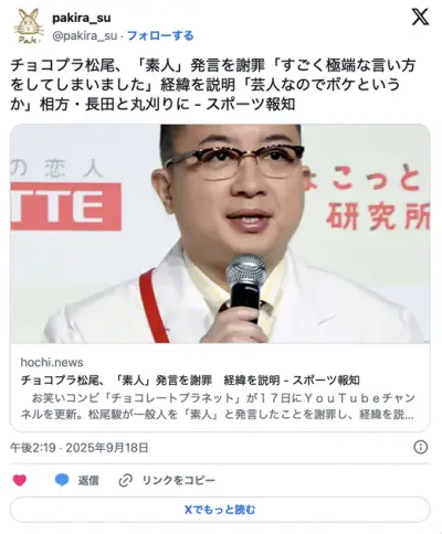 【お笑い】チョコプラ松尾、「芸能人とかアスリート以外はSNSやるな」「素人が何発信してんだって」発言に批判殺到し炎上