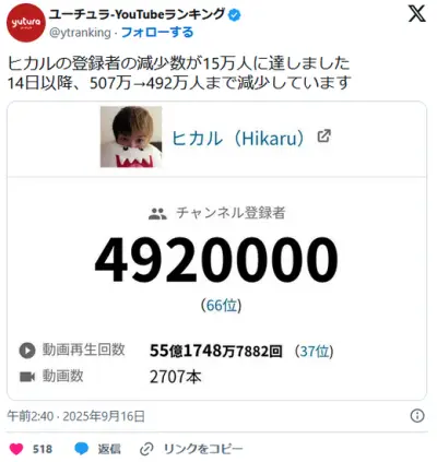 大炎上のヒカル、登録者減少は過去最速ペースか これまでのトップYouTuberの炎上と比較