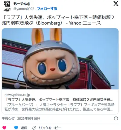 「ラブブ」人気失速、ポップマート株下落-時価総額2兆円弱吹き飛ぶ
