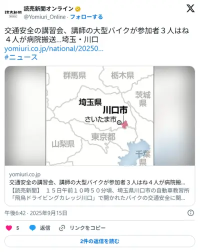 交通安全の講習会、60歳代講師の大型バイクが参加者3人はね4人が病院搬送