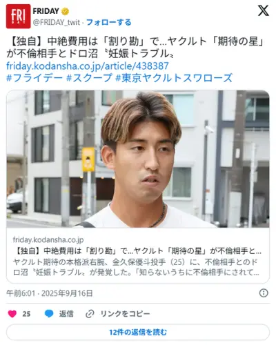 【野球】中絶費用は「割り勘」で…ヤクルト「期待の星」金久保優斗が不倫相手とドロ沼〝妊娠トラブル〟
