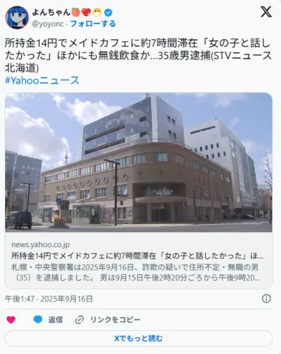 所持金14円でメイドカフェに約7時間滞在「女の子と話したかった」35歳男逮捕