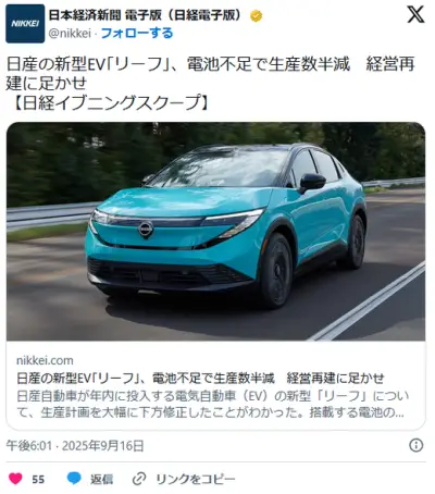 日産の新型EV「リーフ」、電池不足で生産数半減 経営再建に足かせ