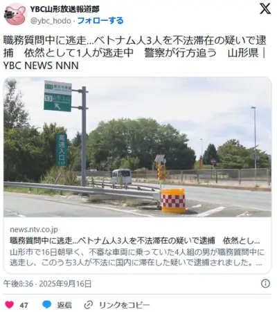 【山形】職務質問中に逃走…ベトナム人3人を不法滞在の疑いで逮捕 依然として1人が逃走中 警察が行方追う