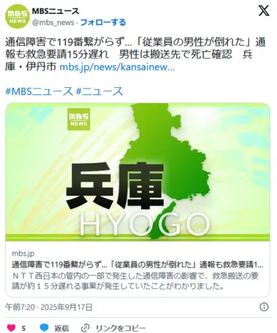 通信障害で119番繋がらず「従業員が倒れた」通報も救急要請15分遅れ 搬送先で死亡確認 兵庫