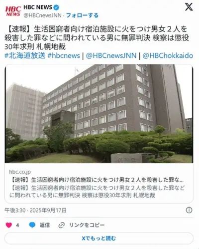 【札幌地裁】生活困窮者向け宿泊施設に火をつけ、男女2人を殺害 被告の70歳男に無罪判決 心神喪失のため