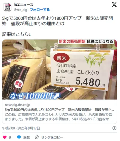 新米価格「5キロ5000円」www もう日本人は米食うなってことだな
