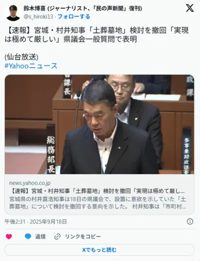 宮城県知事「土葬の検討やっぱ撤回するわwwwwww」