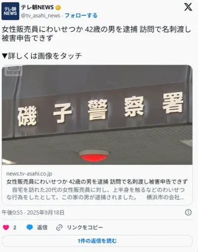 自宅を訪れた美人女性販売員(22)にキスした男逮捕・・・「胸はもんでいません」