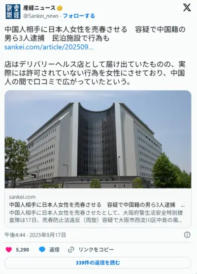 【大阪】中国人相手に日本人女性を売春させる 容疑で中国籍の男ら3人逮捕 民泊施設で行為も