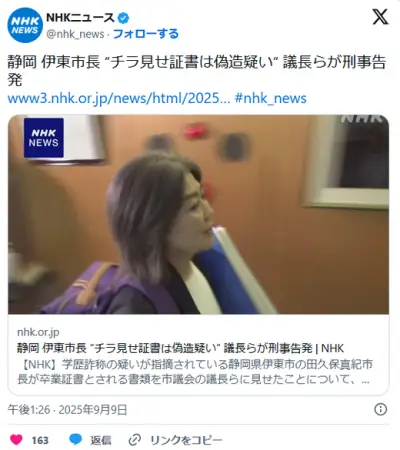 静岡 伊東市長 ”チラ見せ卒業証書は偽造疑い” 議長らが刑事告発