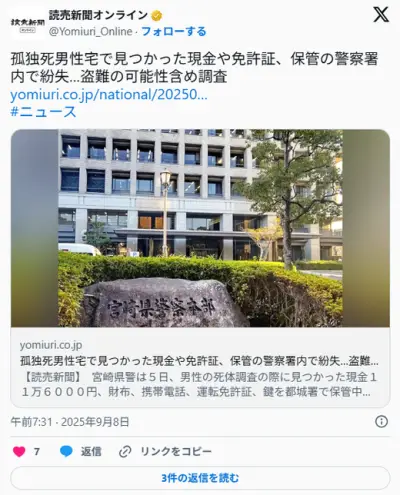 宮崎県警「孤独死男性の部屋にあったたんす預金11万円を署内で紛失しました」