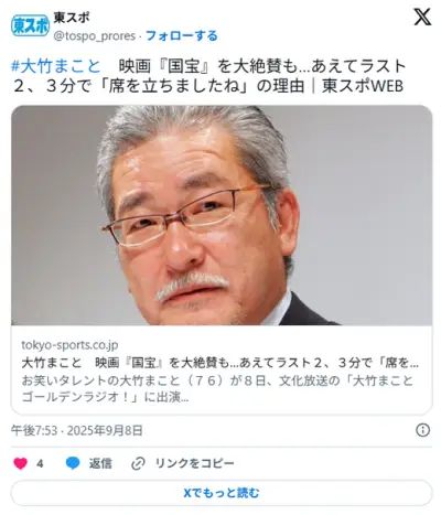 大竹まこと 「映画『国宝』、見終わる前に帰ってやった。俺かっこいい。映画に勝った。偏屈でなく根性」