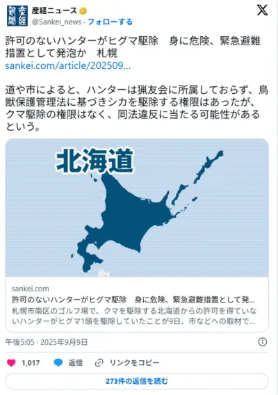ヒグマに襲われたシカ免許しかないハンター、違法に発砲し射殺、北海道警察は厳罰に処す方針