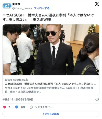 【芸能】ニセEXILE・ATSUSHI 橋幸夫さんの通夜に参列 報道陣も本人だと思い込みインタビューも 「本人ではないです…申し訳ない」