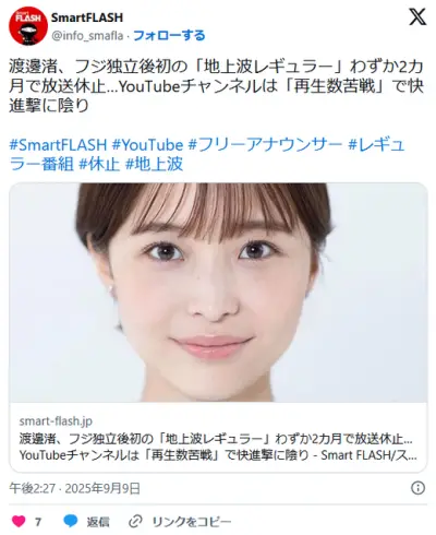 【芸能】渡邊渚アナ、フジ独立後初の『地上波レギュラー』わずか2カ月で放送休止… YouTubeチャンネルは「再生数苦戦」で快進撃に陰り