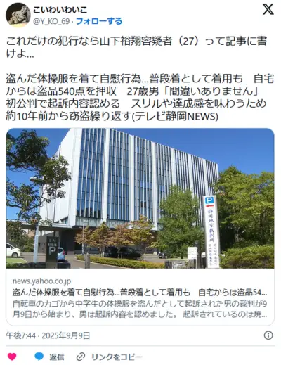 【画像無】盗んだ体操服を着て自慰行為…普段着として着用も 自宅からは盗品540点を押収 27歳男