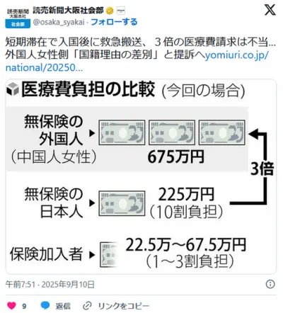 短期滞在で入国後に救急搬送、3倍の医療費請求は不当…中国人女性側「国籍理由の差別」と提訴へ