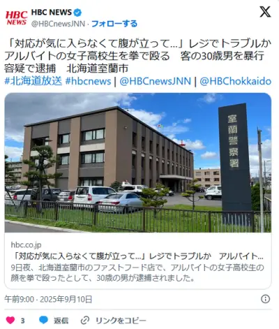 バイトの態度が悪いとバイトの女子高生の顔を拳で殴る 会社員の男逮捕