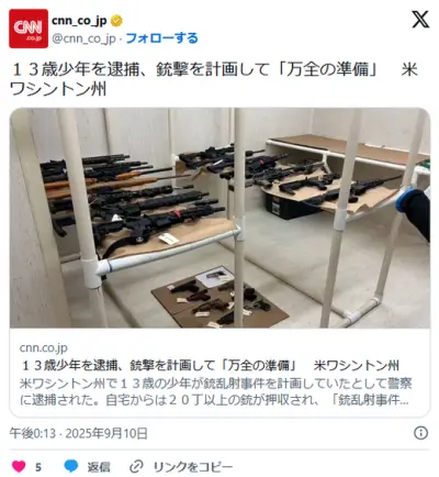 13歳少年を逮捕、銃撃を計画して「万全の準備」 米ワシントン州…23丁の銃器と弾薬を押収