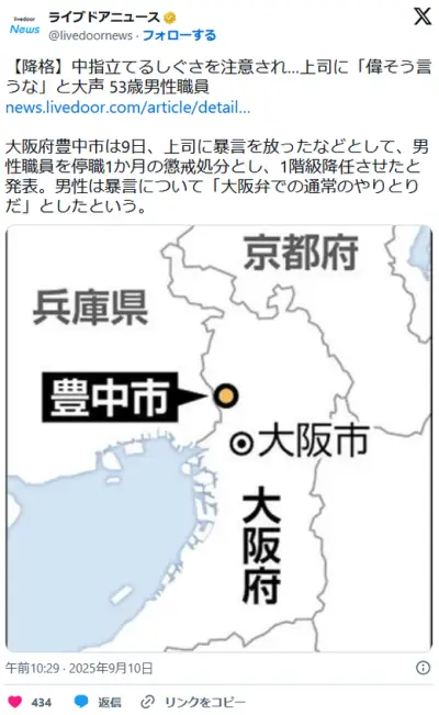【大阪】中指立てるしぐさを注意した上司に「偉そう言うな」と大声…降格の53歳「大阪弁の通常のやりとりだ」 豊中市