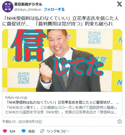 【悲報】「裁判費用はは党が払う」NHK党を信じた信者、督促状まみれで夜中に泣く