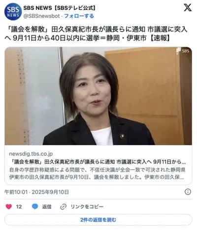 田久保真紀 伊東市長が議会を解散「お前ら私を辞めさせたいならもう一度選挙戦って戻ってからなw」