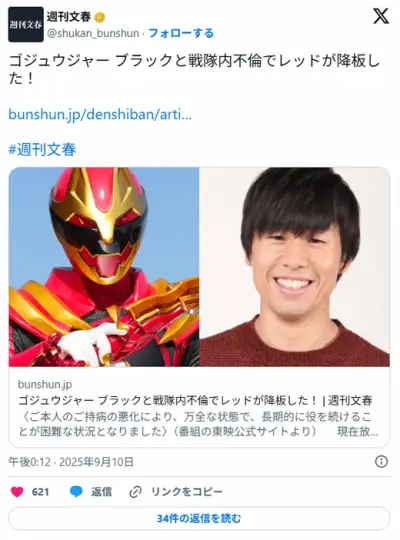 【悲報】戦隊ヒーローのレッドがゲス不倫で降板 文春砲