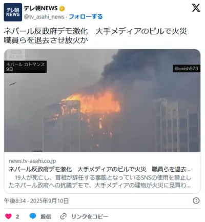 【国際】ネパールのSNS規制に対する抗議デモが激化 大手メディアの建物が放火され炎上