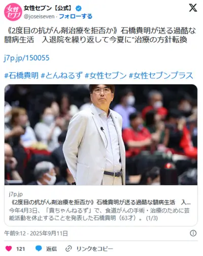 【画像】石橋貴明(63歳)ガリガリ激ヤセ、食道がんで食道切除、咽頭がん併発で抗癌剤治療