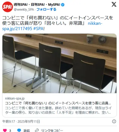 コンビニで「何も買わない」のにイートインスペースを使う客に店員が怒り「図々しい。非常識」(浜カツトシ氏)