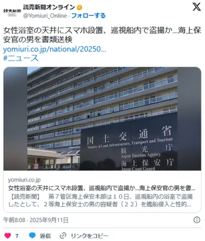 女性浴室の天井にスマホ設置、巡視船内で盗撮か…海上保安官の男を書類送検