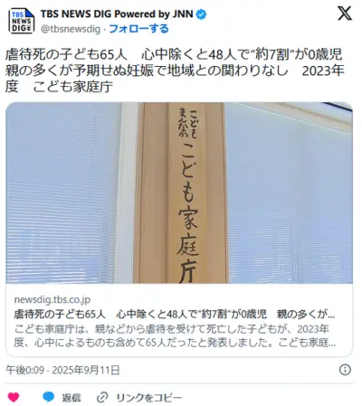 【こども家庭庁】虐待死の子ども65人 心中除くと48人で“約7割”が0歳児 親の多くが予期せぬ妊娠で地域との関わりなし 2023年度
