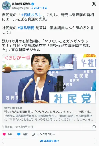 福島瑞穂氏「石破首相、残り1カ月やりたいことガンガンやって!最後っ屁で戦後80年談話を」