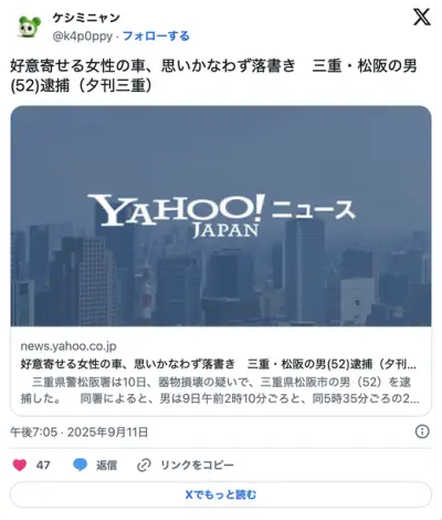 52歳の男、好意を寄せる40代女性が相手をしてくれないので憤怒 女性の車に「あほ」と落書きして逮捕
