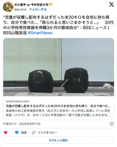 児童が収穫し配布するはずだった米20キロを自宅に持ち帰り、自分で食べた小学校教諭停職3か月