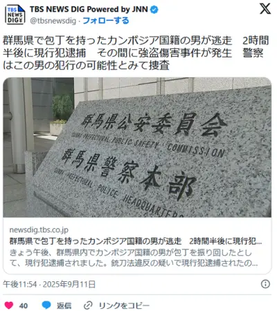 【群馬】包丁を持ったカンボジア国籍の男が逃走 2時間半後に現行犯逮捕 その間に強盗傷害事件が発生 事件に関与か