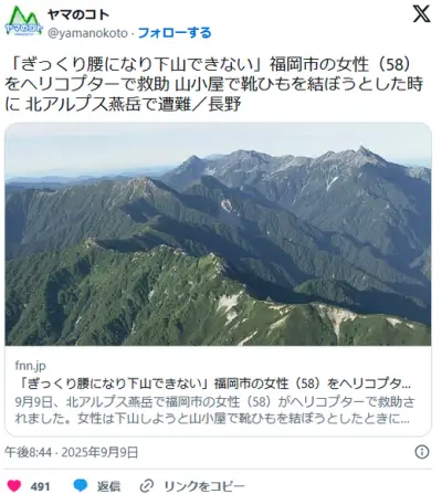 「ぎっくり腰になり下山できない」福岡市の女性(58)をヘリコプターで救助 山小屋で靴ひもを結ぼうとした時に 北アルプス燕岳で遭難