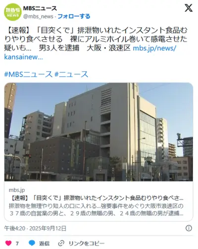 「目突くで」排泄物いれたインスタント食品むりやり食べさせる 裸にアルミホイル巻いて感電させた疑いも… 男3人を逮捕 大阪・浪速区