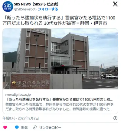 【特殊詐欺】「断ったら逮捕状を執行する」警察官かたる電話で1100万円だまし取られる 30代公務員女性が被害 静岡