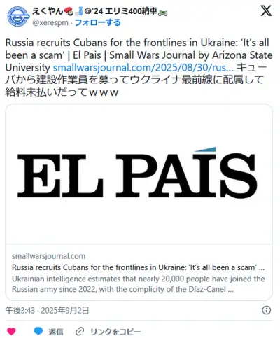 ロシアが月給36万7000円で建設作業員募集、自国を脱出したい18歳~62歳のキューバ人7000人が応募、ウクライナ最前線に配属、給料未払い