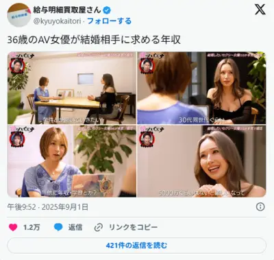【画像】AV女優さんが結婚相手に求める年収、酷過ぎて炎上