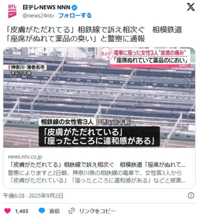 【神奈川】「皮膚がただれてる」相鉄線で訴え相次ぐ 相模鉄道「座席がぬれて薬品の臭い」と警察に通報