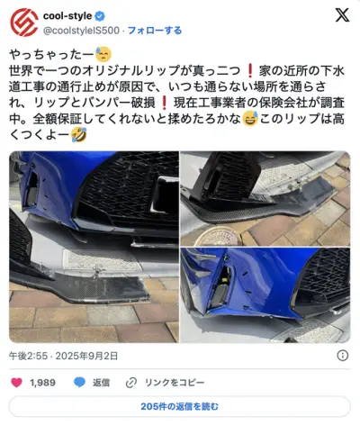 車カス「下水工事で迂回されられ世界でただ一つのオリジナルリップスポイラーが割れました。請求」